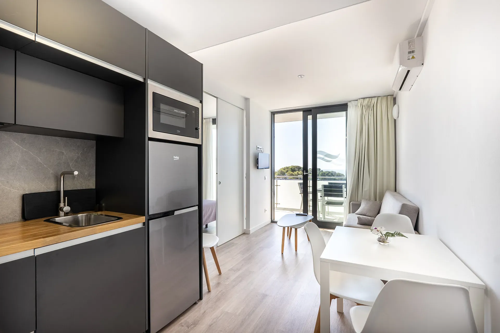 L’établissement propose des appartements pour 2 à 6 personnes, dotés d’une kitchenette entièrement équipée, d’un salon, d’une terrasse ou d’un balcon, ainsi que d’une salle de bain complète. Tous les hébergements disposent de climatisation, Wi-Fi, télévision et rangements adaptés pour des séjours prolongés. Les appartements supérieurs offrent un espace plus généreux, apprécié des groupes ou des cyclistes souhaitant optimiser leur confort et leur organisation.